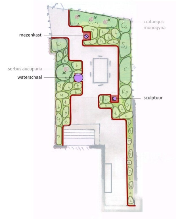 De ontworpen compositie is - naast de uitgangspunten vanuit de klant en het microklimaat - geïnspireerd op de schuifpuzzel van kraampjes op de Noordermarkt zelf. Daarbij worden de kramen zo gepositioneerd dat er functionele ruimtes ontstaan in de vorm van paden en pleintjes. Zoals je over de markt loopt langs alle koopwaar, zo beweeg je door deze stadstuin langs een verzameling van blad, bloem en (kunst-)object. Uit de borders zijn nisjes gespaard voor een sculptuur, waterschaal en mezenkast op pilaar. Er komt een volledig nieuw beplantingsplan dat voor meer dieptezicht en ruimtegevoel gaat zorgen en aandacht heeft voor de lokale ecologie, een lange bloeiboog en het oplichten van de schaduwtuin. De oude waaltjes die worden verwijderd om de borders uit te breiden, worden hergebruikt in de vorm van borderranden.